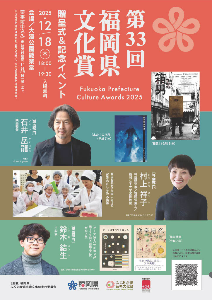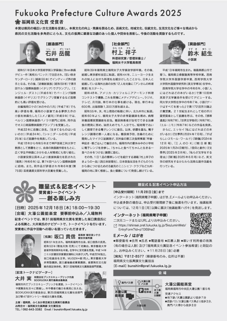福岡県では、文化振興に顕著な功績のあった個人や団体に「福岡県文化賞」を贈呈しており、ブックスキューブリック店主の大井が選考委員を務めております。本年の受賞者の功績を称える文化賞贈呈式及び記念イベントが、12月18日に大濠公園能楽堂で開催され、大井が記念の受賞者トークイベント「創る楽しみ方」のナビゲーターを務めます。
